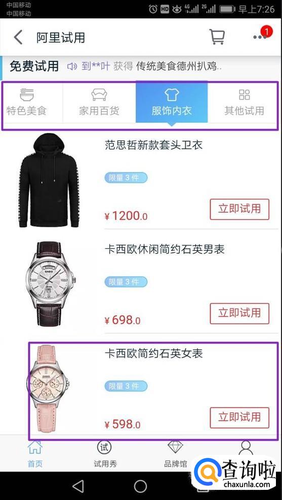 进入之后,我们下拉一些,就可以看到试用的分类了,之后我们任意选择一个试用的产品,点击进入;