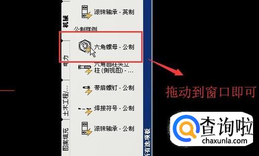 我们选择公制样例下面的六角螺母,直接将它拖拽到绘图区域即可,如下图所示