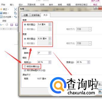 如果该图片的长宽被锁定无法编辑,点击如图位置的斜向下的小箭头,呼出“布局”对话框,取消选中“锁定纵横比”,再在上方高度、宽度后面分别输入5.4厘米、8.56厘米,输入完成后点击下方的“确定”按钮,图片长宽即可被调整至预设大小。