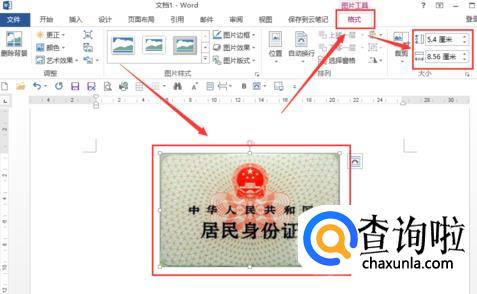 裁剪完成后,仅留下身份证图片,在“图片工具-格式”下方的“大小”区域的如图位置输入身份证实际大小的数值:5.4*8.56cm,按下回车键,被选中的图片就会被调整为身份证实际大小。