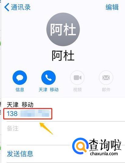 点击其中任意一个联系人,我们就能查看到他的手机号码,如果之前添加过通讯地址、邮箱、QQ等,这里也都会有显示;