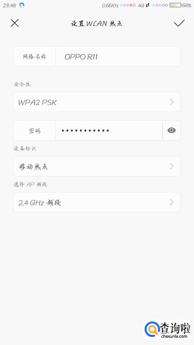 在这里可以设置热点的安全性,密码和频段等等,设置好之后点钩。