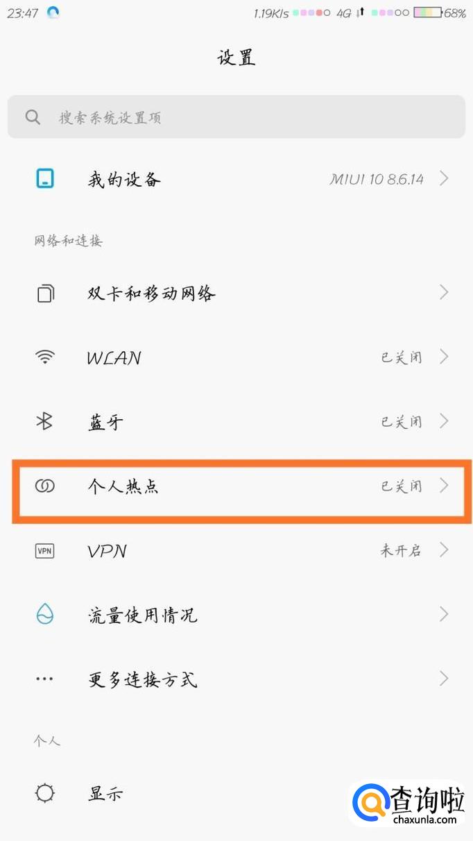 首先打开设置,找到"个人热点"一栏,点击进入。