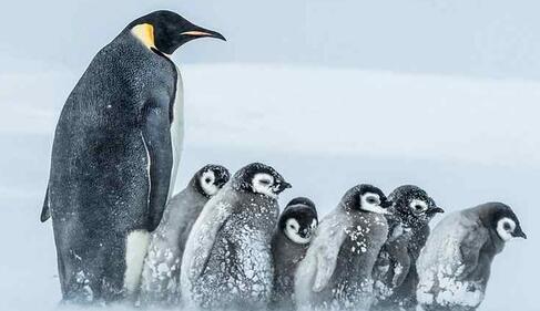 帝企鹅在南极严寒的冬季冰上繁殖后代,雌企鹅每次产1枚蛋,雄企鹅孵蛋。雄帝企鹅双腿和腹部下方之间有一块布满血管的紫色皮肤的育儿袋,能让蛋在环境温度低达零下40摄氏度的低温中保持在舒适的36摄氏度。