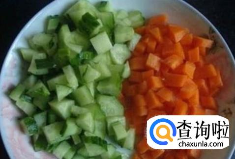 把鸡胸肉洗干净切成小丁,青瓜、红萝卜切成小丁,蒜蓉、姜蓉准备好。