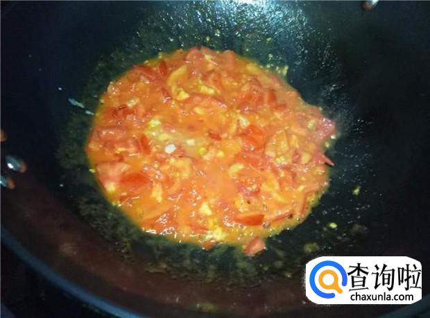 把番茄炒出番茄汁,然后把鸡蛋液给倒进去。