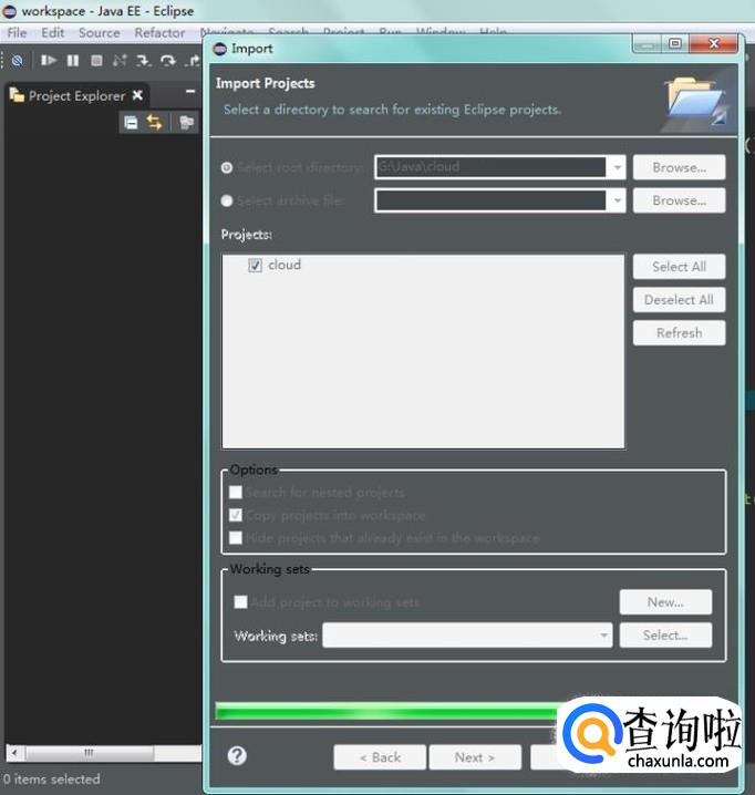如果正在使用的工作目录中没有刚刚选择的项目,项目框中的项目会被自动勾选,否则会提示有相同项目,不能导入,最后点击“Finish”,等待导入;