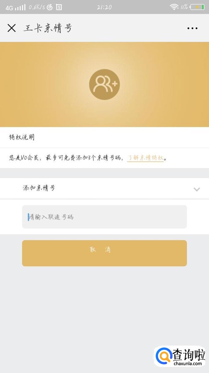 会出现一个新的界面,如图1所示。点击“添加亲情号”这个选项,如图2箭头所示。会出现一个新的界面,如图3所示。输入要添加的联通亲情号就可以了。