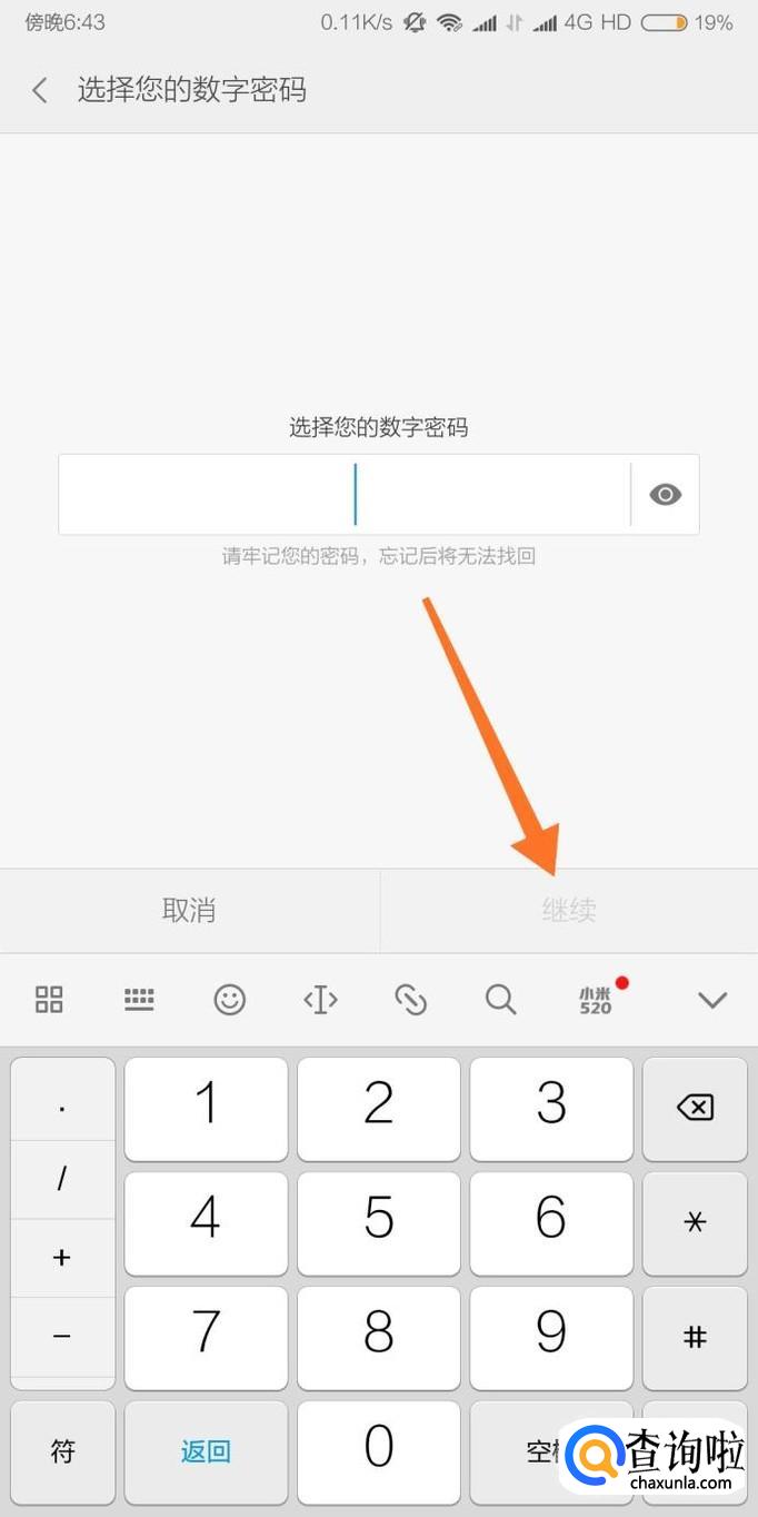 输入四位数的密码后,点击“继续”即可。大家一定要记住密码,否则只能通过清除手机数据的方式,才能正常使用手机。
