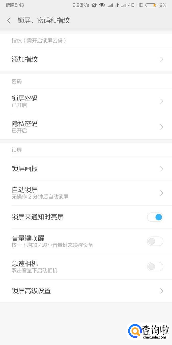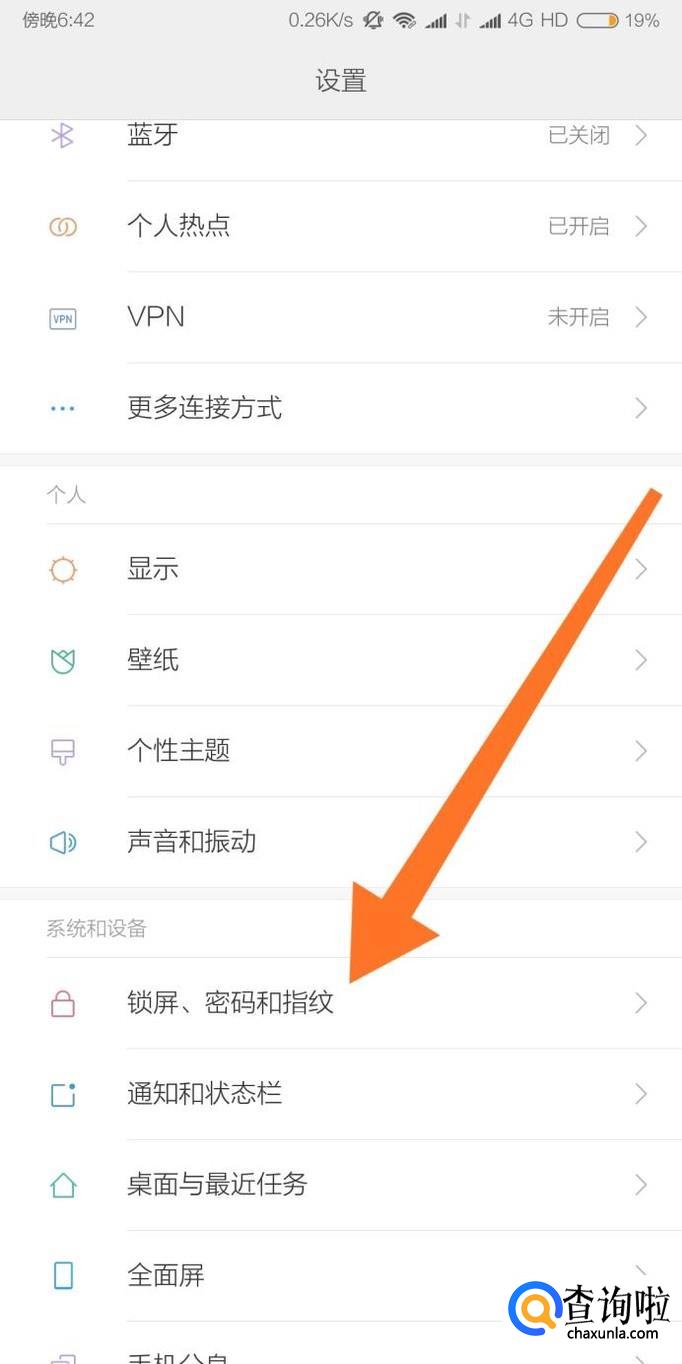 首先我们进入到手机的设置,找到“锁屏、密码和指纹”设置选项,点击进入。