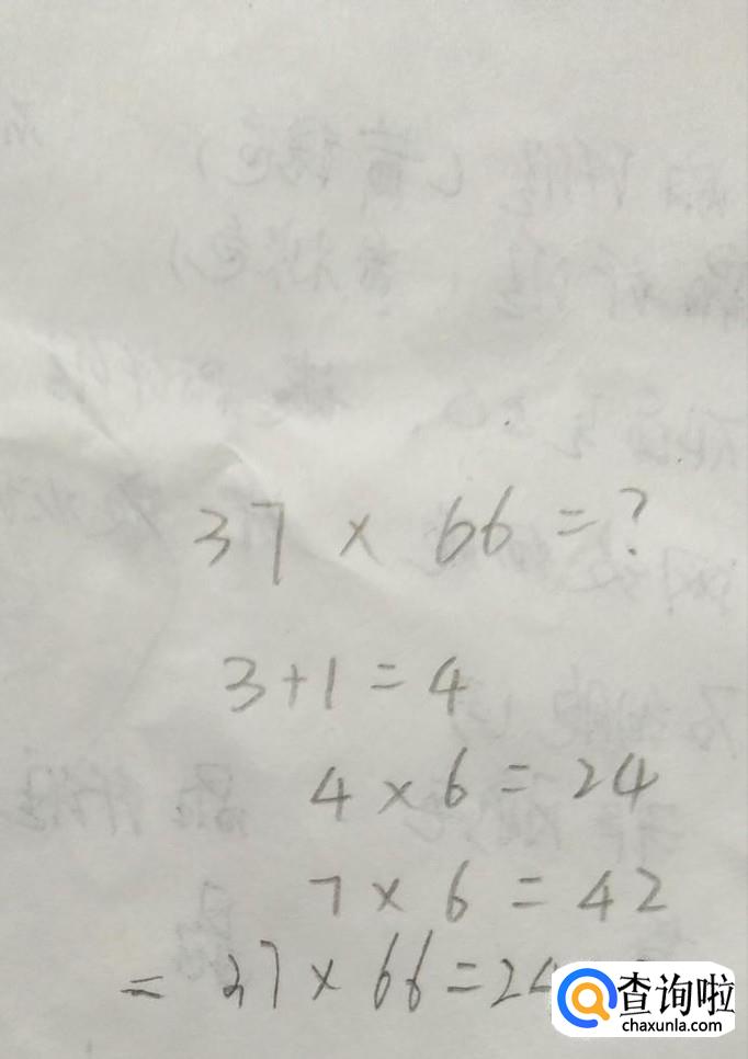 第一个乘数互补,另一个乘数数字相同的速算方法:一个头加1后,头乘头,尾乘尾,例如37*66=?