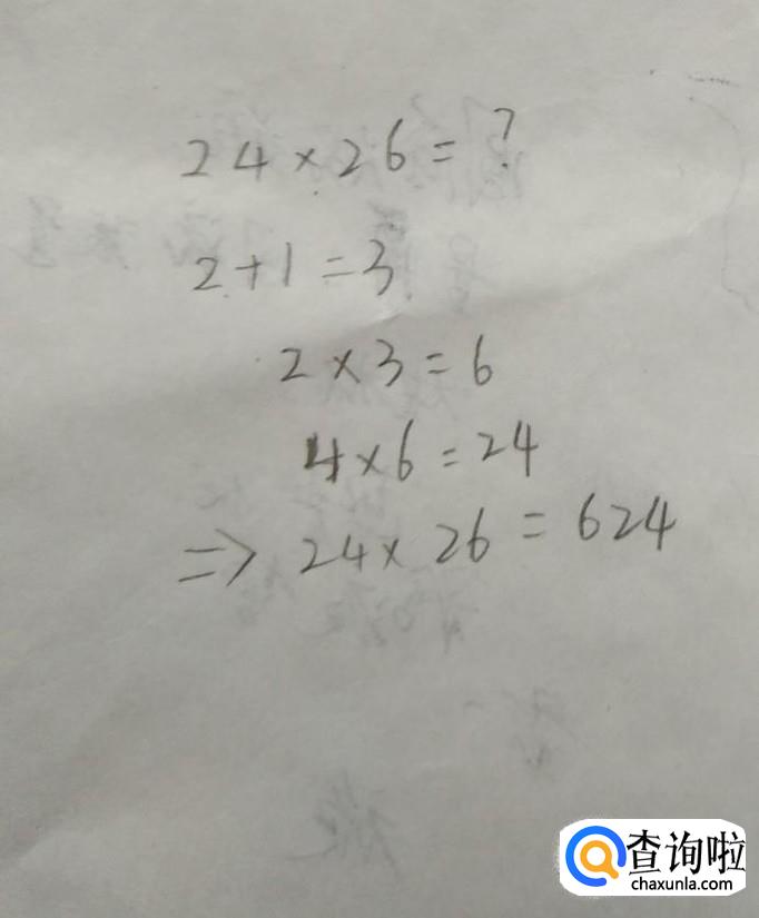 十位相同,个位相加等于10的速算方法:一个头加1后,头乘头,尾乘尾,例如24*26=?