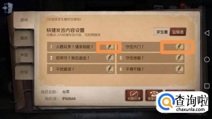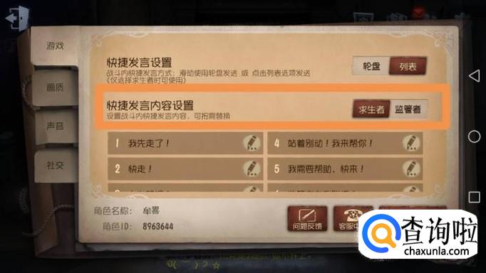 快捷发言设置可以设置快捷发言是轮盘还是列表,快捷发言内容设置可以选择求生者还是监管者。但是不管是求生者还是监管者发言内容只能选择官方预设的那几条。点击发言内容后面那个铅笔图标就可以重新选择发言内容了