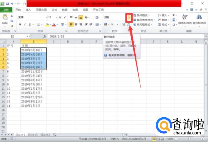 打开表格之后,我们选中日期中的几行,然后点击【开始】选项卡下的【数字】上方常规旁边的【小三角】,找到之后单击它,如图所示。