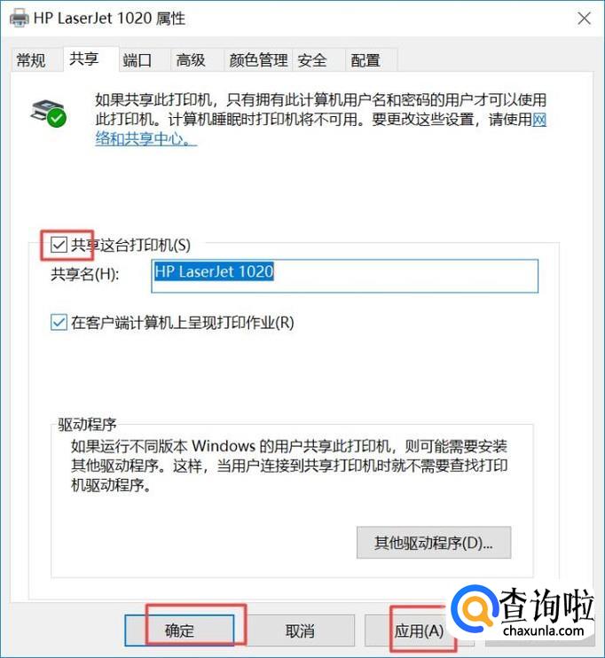 弹出的界面,我们将共享这台打印机给勾选上,然后点击应用,最后点击确定,之后别人就可以通过网络进行搜索到该打印机,然后就可以打印了。
