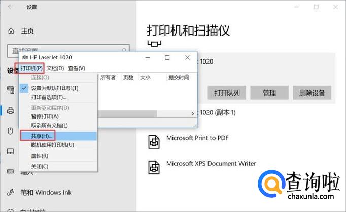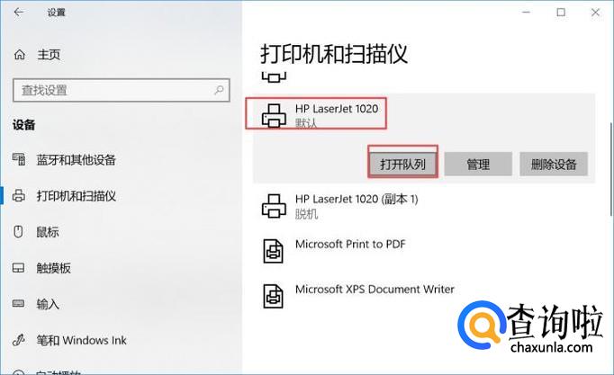 之后我们点击我们连接的打印机,弹出的界面,我们点击打印队列;