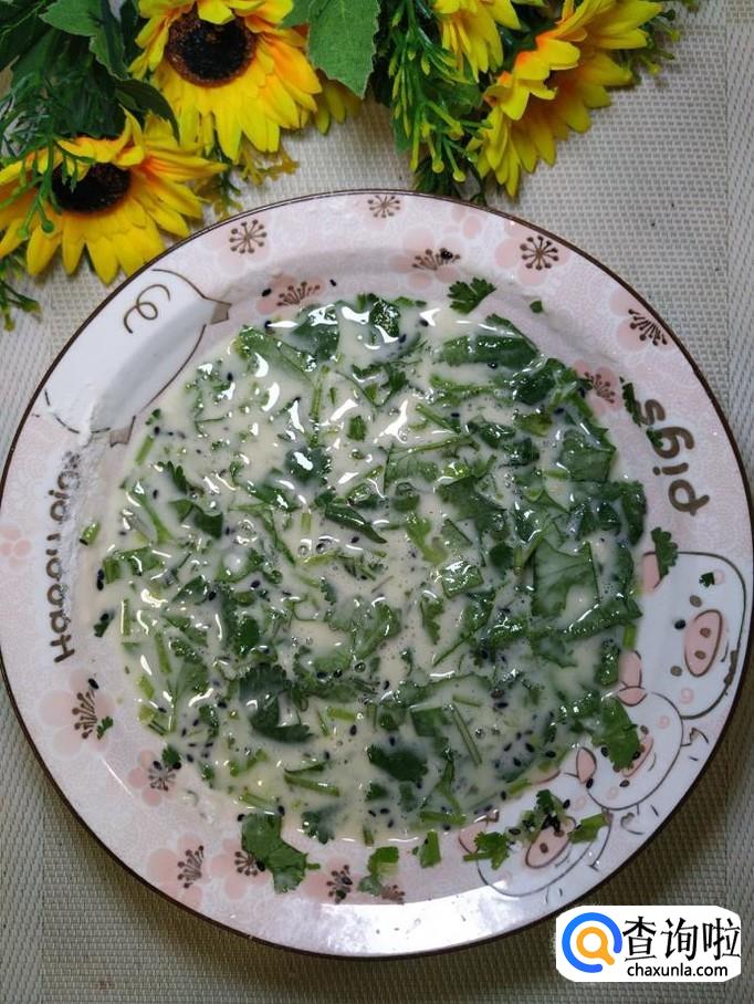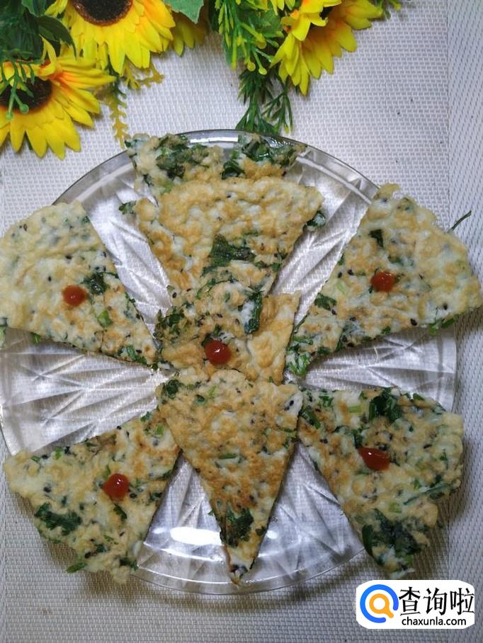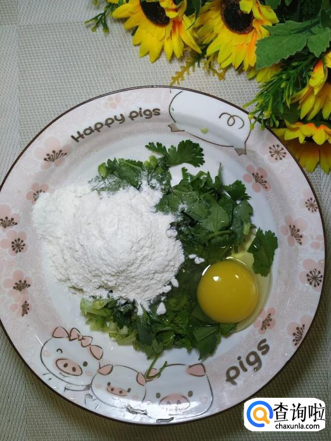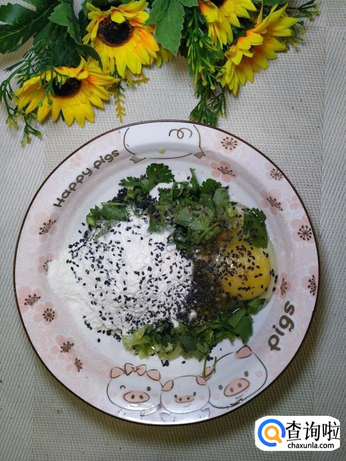 香菜适量,鸡蛋适量,面粉适量,盐适量,鸡精适量,五香粉适量,黑芝麻适量,番茄酱适量。