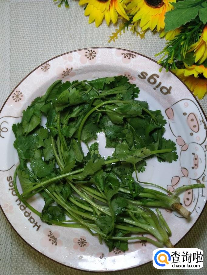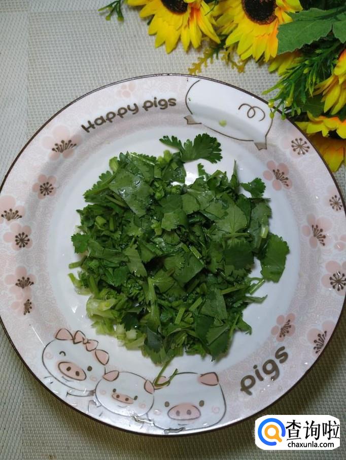 准备适量香菜,洗净后去,除根部,将茎的部分切碎,叶子部分可以切的稍微大一些。