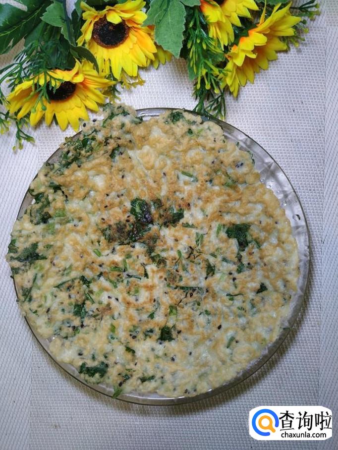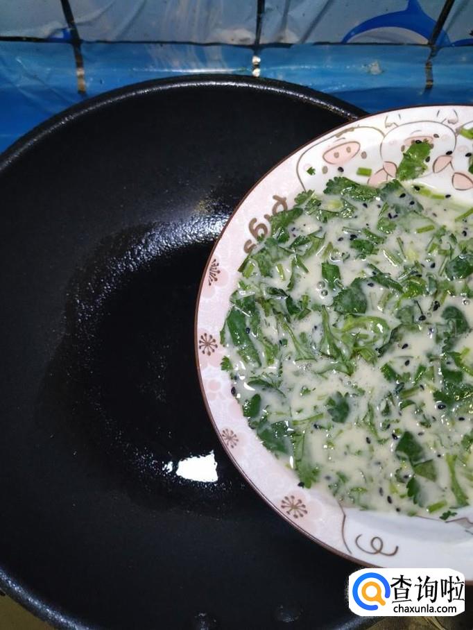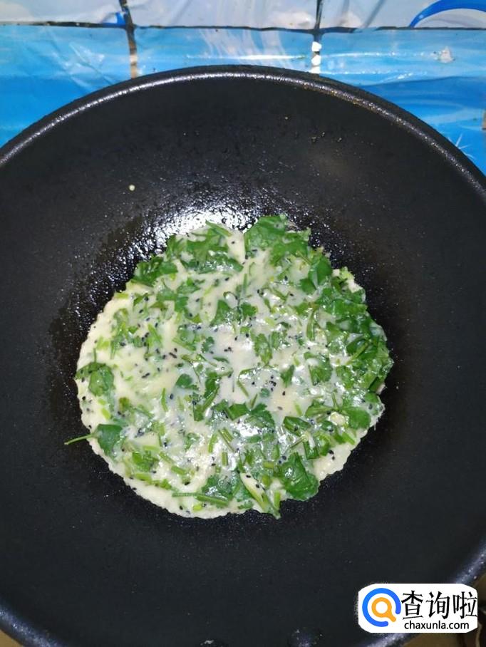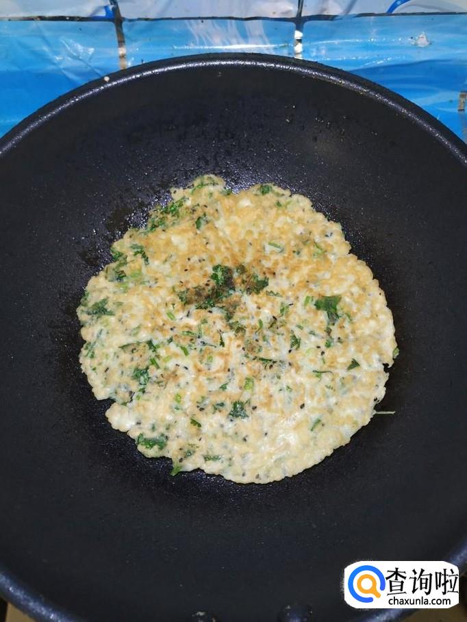 平底锅放入适量油,油热后将面糊倒入锅中,摊成圆饼,尽量摊得稍微薄一些,这样口感更好。