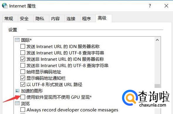 在高级中找到加速的图形选项,将下图箭头所指的选框取消勾选,就启动了硬件加速,重启下电脑,电脑速度会有所提升