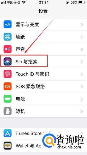 之后再点击【设置】页面中的【Siri与搜索】按键。