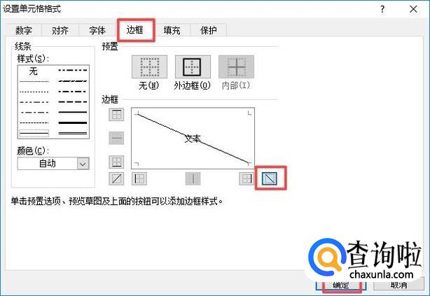 弹出的界面,我们点击边框,然后点击斜线,之后我们点击确定;