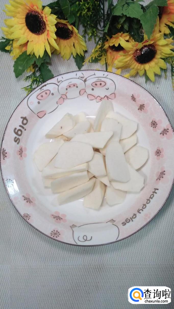 准备一个红薯,洗净后去皮,切成菱形块,尽量切得均匀一些,切好后放入盘中备用。