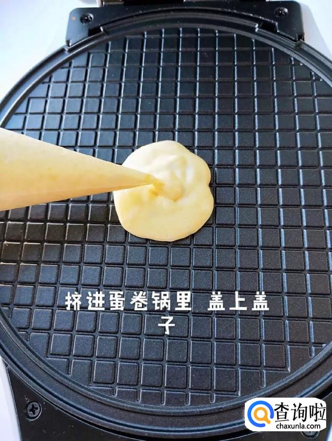 然后把面和装进裱花袋挤进蛋卷机中,盖上盖子,如下图所示。