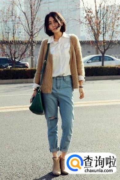 白衬衫配针织外套。这样的搭配比较适合个子高并且比较瘦的女生,会显得会温柔很有气质。