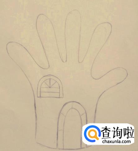 然后我们在手掌的左上角画出一个窗户,并在手掌的右下角画出一个门。至于窗户和门的花纹,可以让小朋友发挥想象力,随意画出不同的花纹即可。