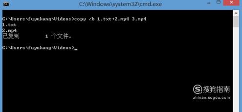 在当前文件夹,点击左上角的“文件”,再点击“打开命令提示符”,然后在命令窗口输入“copy /b 1.txt+2.mp4 3.mp4”并回车.