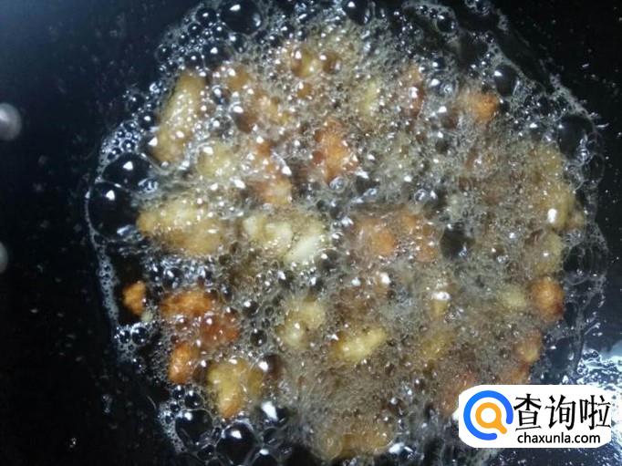 全程都要用小火来炸,还要不停的搅拌,使其均匀受热,炸到鸡肉金黄的时候就可以出锅了。