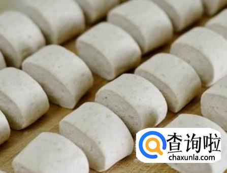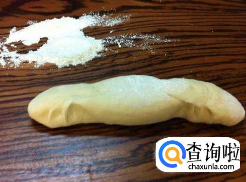 一个小时后,将面团从面盆中取出,这时已经发得很大了,在面板上面铺点干面粉,将面团搓成长长的圆条,如果不会揉馒头,就用刀切成均匀的块。