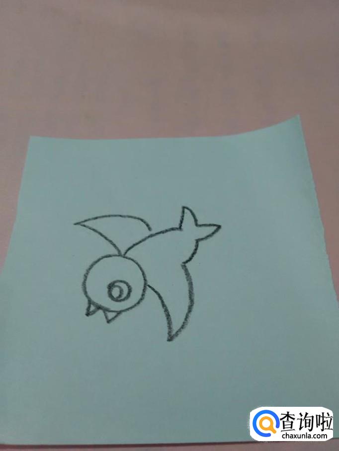 在头的右侧,画两条弯弯的折线,表示小鸟的两只翅膀。