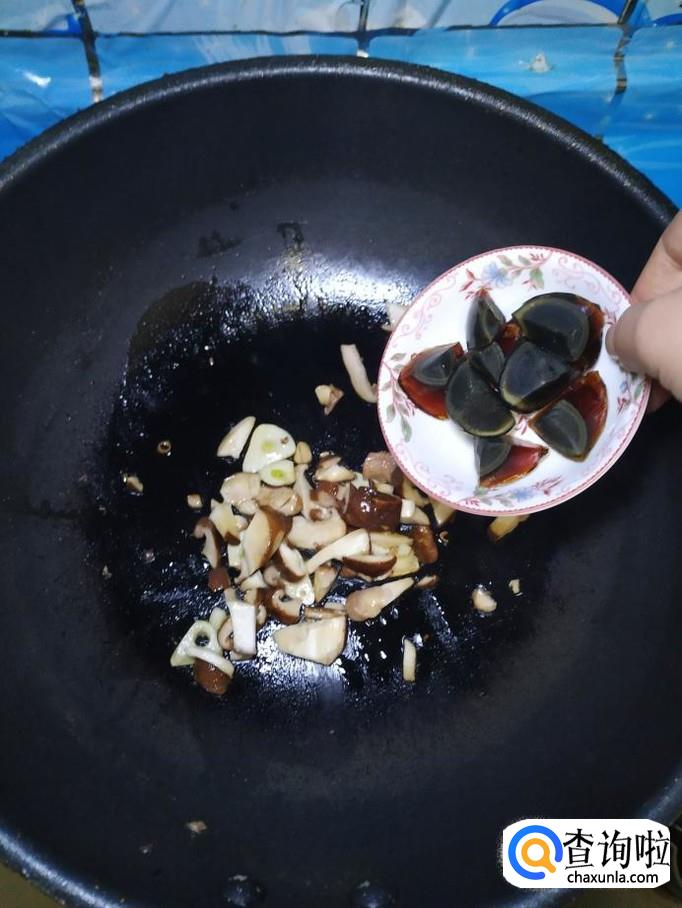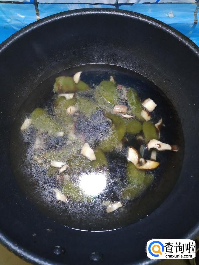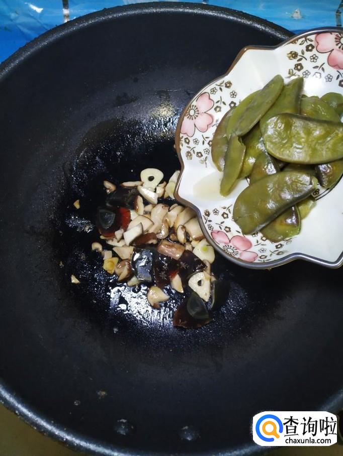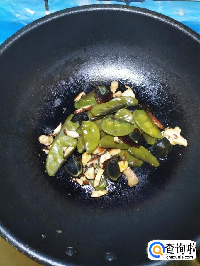 炒至香菇开始变软之后,将松花蛋和扁豆,放入锅中,翻炒均匀。