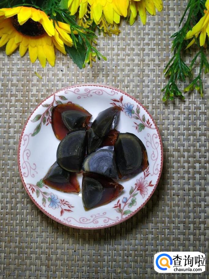 准备一个松花蛋,放入锅中,煮4到5分钟,然后取出过凉水,去皮后切块备用。