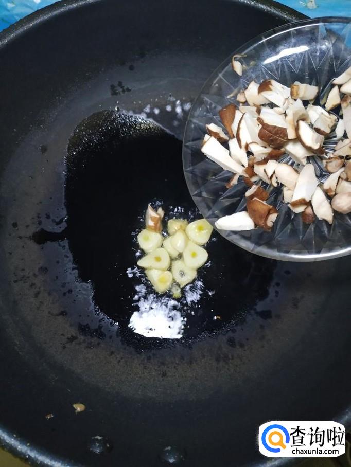 准备适量蒜,洗净后切片,炒锅中放入适量油,油热后将蒜片放入锅中炒香,然后将准备好的香菇块儿,放入锅中,翻炒均匀。