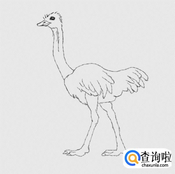 最后在鸵鸟的身体下面画出鸵鸟的两条长长的腿部及脚掌,这样我们的简笔画鸵鸟就画好了如图所示:
