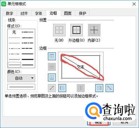 弹出的界面,我们点击图示中的那个位置,就会出现一根斜线,然后我们点击确定;