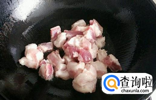 取一个干净的炒锅,锅中放入少许油,猪肉切块状,油热后将猪肉放入炒,炒到8成熟的时候将酱油放入再继续翻炒,炒到完全熟,红烧肉就做好了。