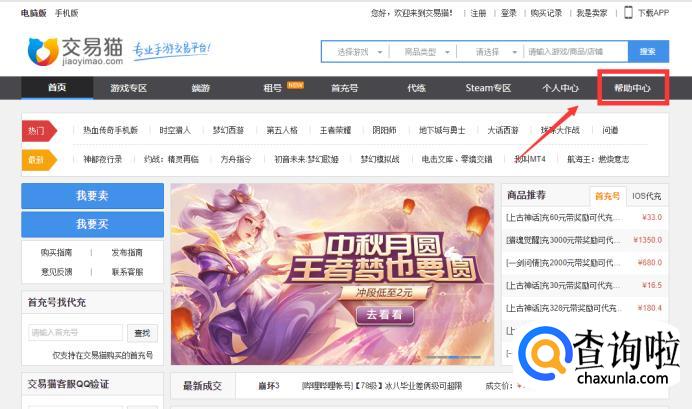 进入交易猫官网后,点击页面右侧的“帮助中心”。