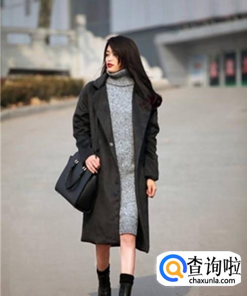 灰色的毛衣长裙加上一件黑色的风衣,整个人的气质立马就提升了,还很彰显身材。