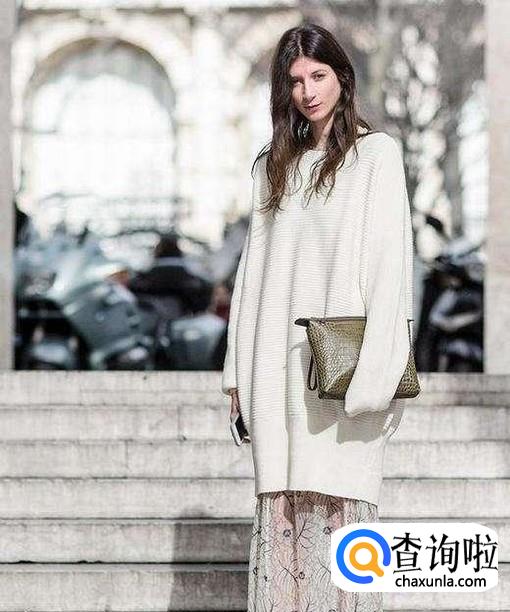 白色的毛衣长裙,加上一条碎花的纱裙,造型也很惊艳,不过这样的搭配有点难驾驭,个子高的可以一试。