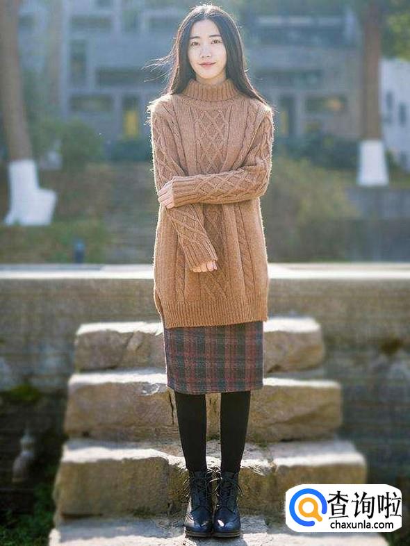 土黄色的长裙还可以搭配中长款的呢子半身裙,再加上一条黑色的打底裤,显得格外淑女。