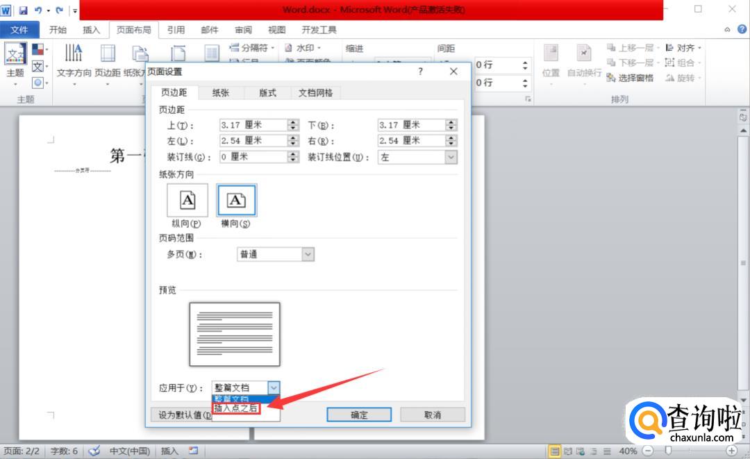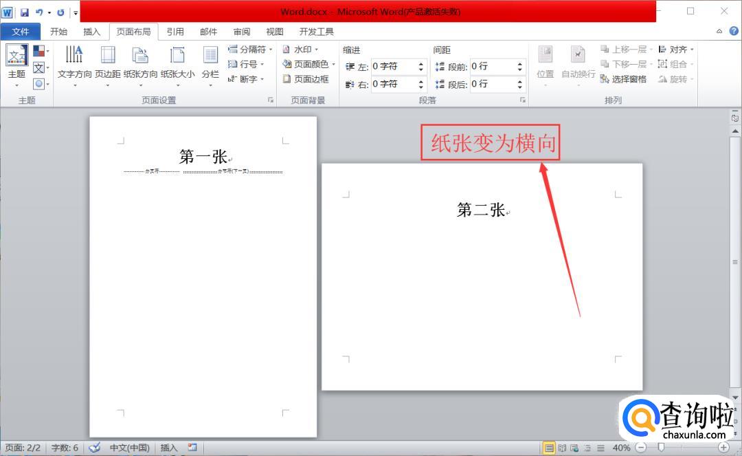 假如我们要将第二页纸变为横向。