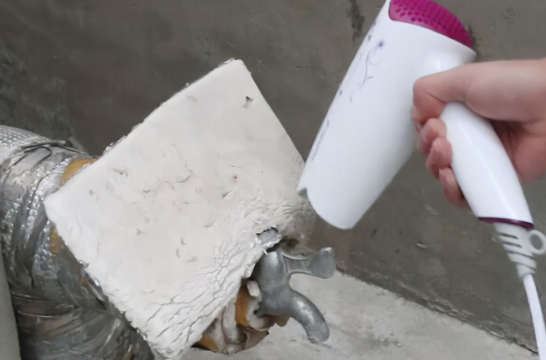 现在咱们家里应该都会有电吹风机,可以采用电吹风机对着冻住的水管吹热风,很快就可以将水管解冻。不过吹的时候,应注意,先从水龙头的位置开始吹,而后再缓慢的吹水管。还应注意,不要对着一个地方使劲吹,要使水管均匀受热,尤其是PPR的水管,不然很可能是水管局部受热严重导致出现损坏。该种方法也比较简单,并且不会像热敷方法似水洒的到处都是,解冻也比较快。当然了,这个需要接通电源的,有些水管在户外没有电源的话,则需要临时拉一个插排,注意临时用电安全。