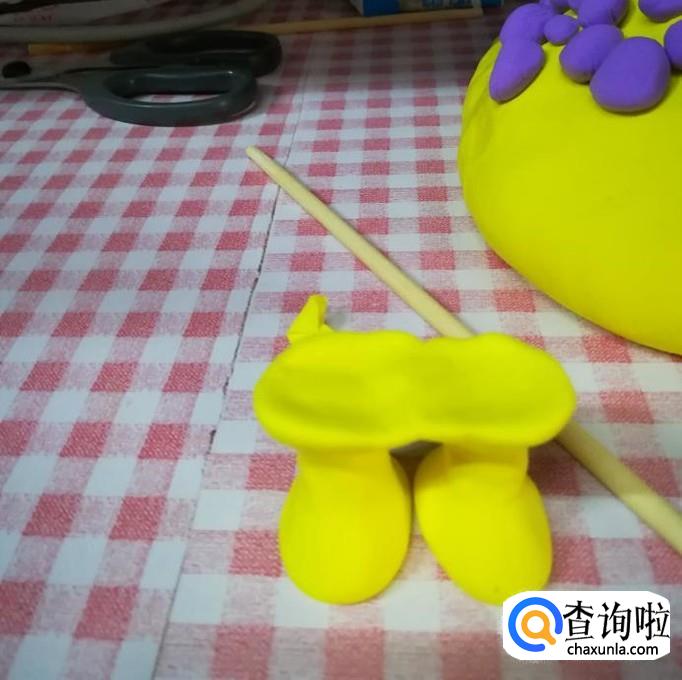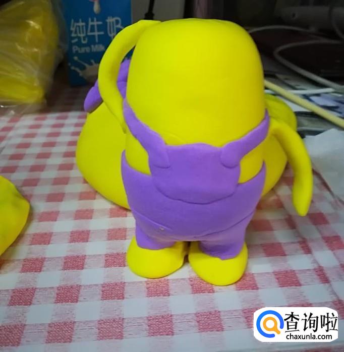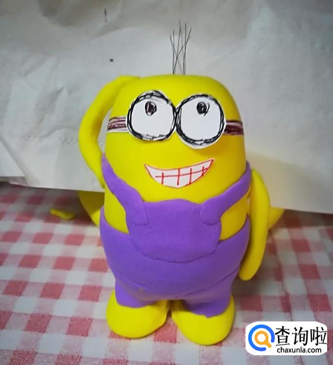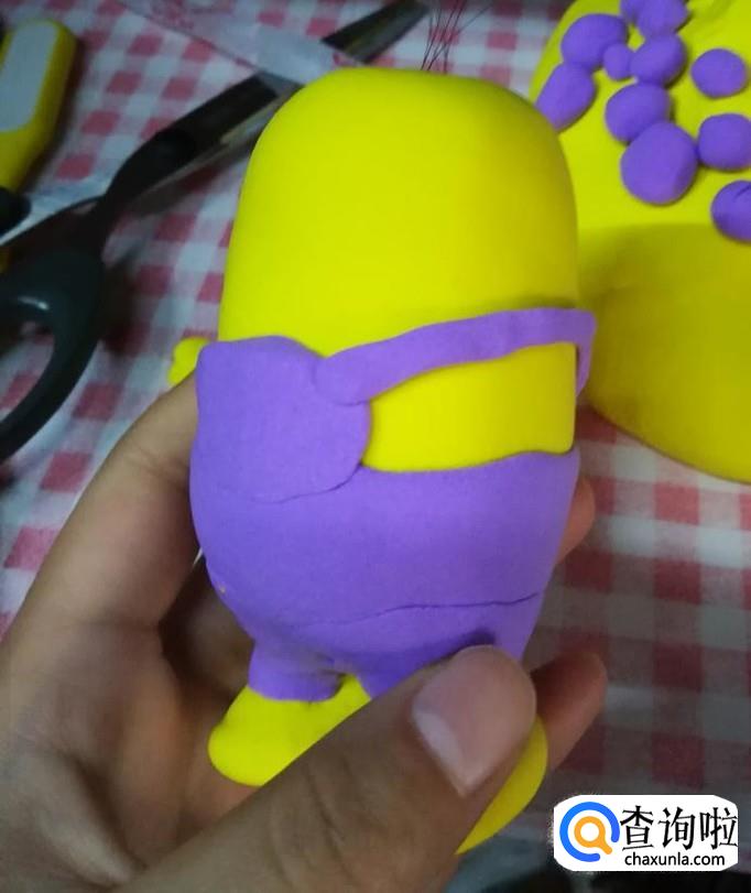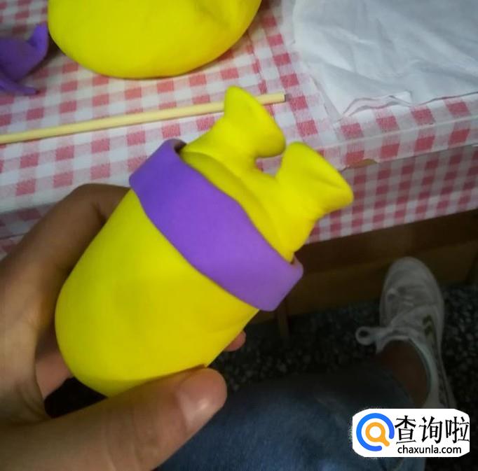 将紫色粘土粘在小黄人下半身,用木棍滚一下,使其贴合,然后重复四步骤,将紫色粘土附着于下半身。
