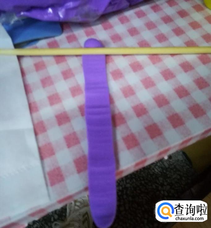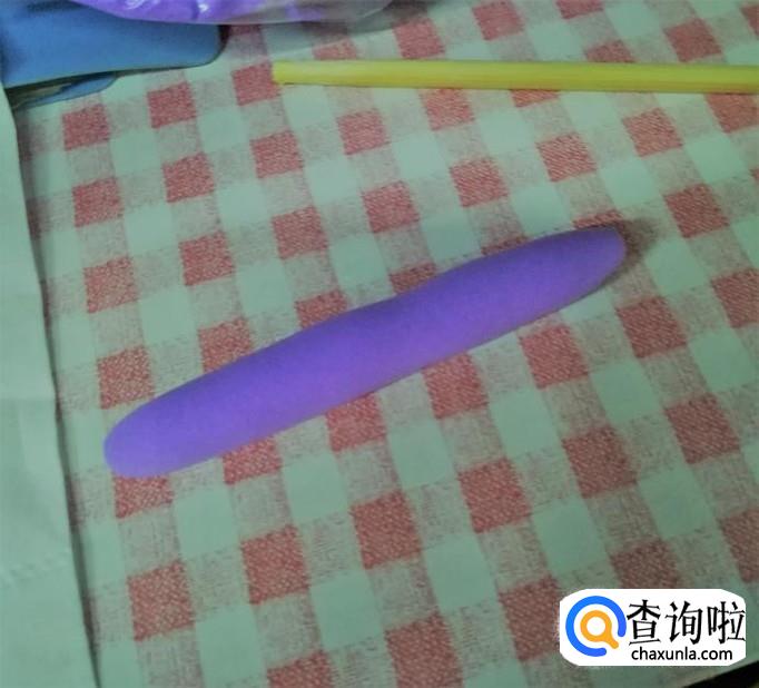 然后开始做小黄人的衣服,取一点紫色粘土,搓成圆条,用小木棍碾平。