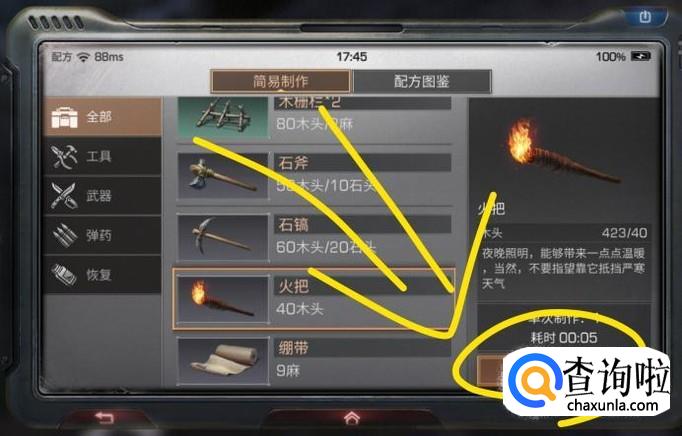 打开“配方”,选择“火把”,点击“制作”,火把制作完成后退出配方。