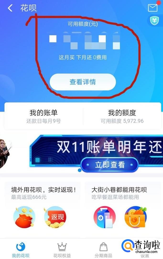 进入后,在菜单栏里面找到“花呗”进入,进入“花呗”后,点击“可用额度”查看。